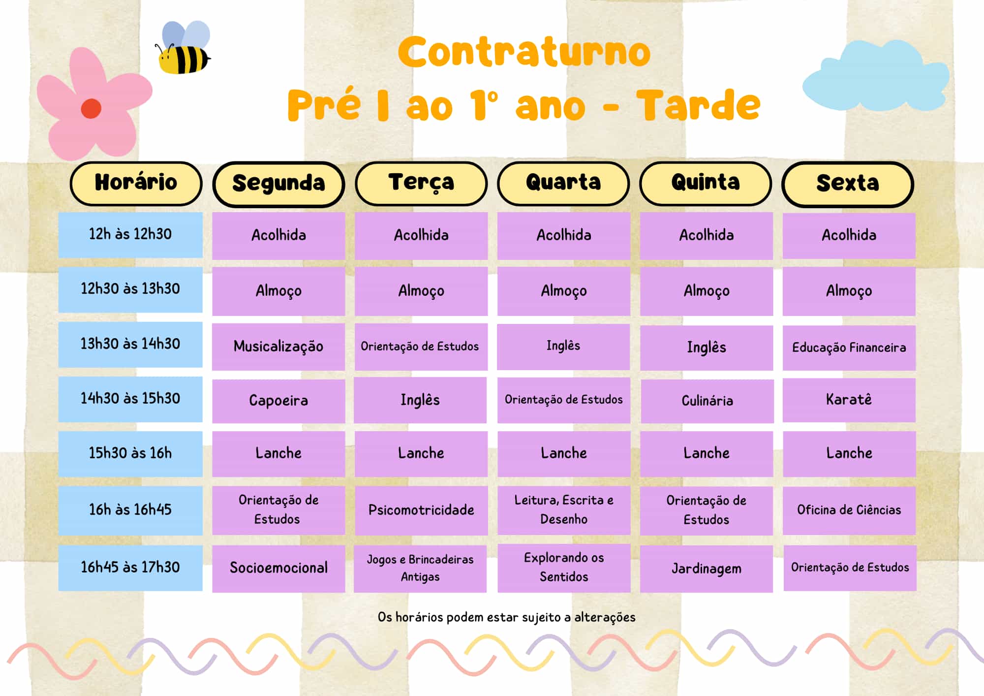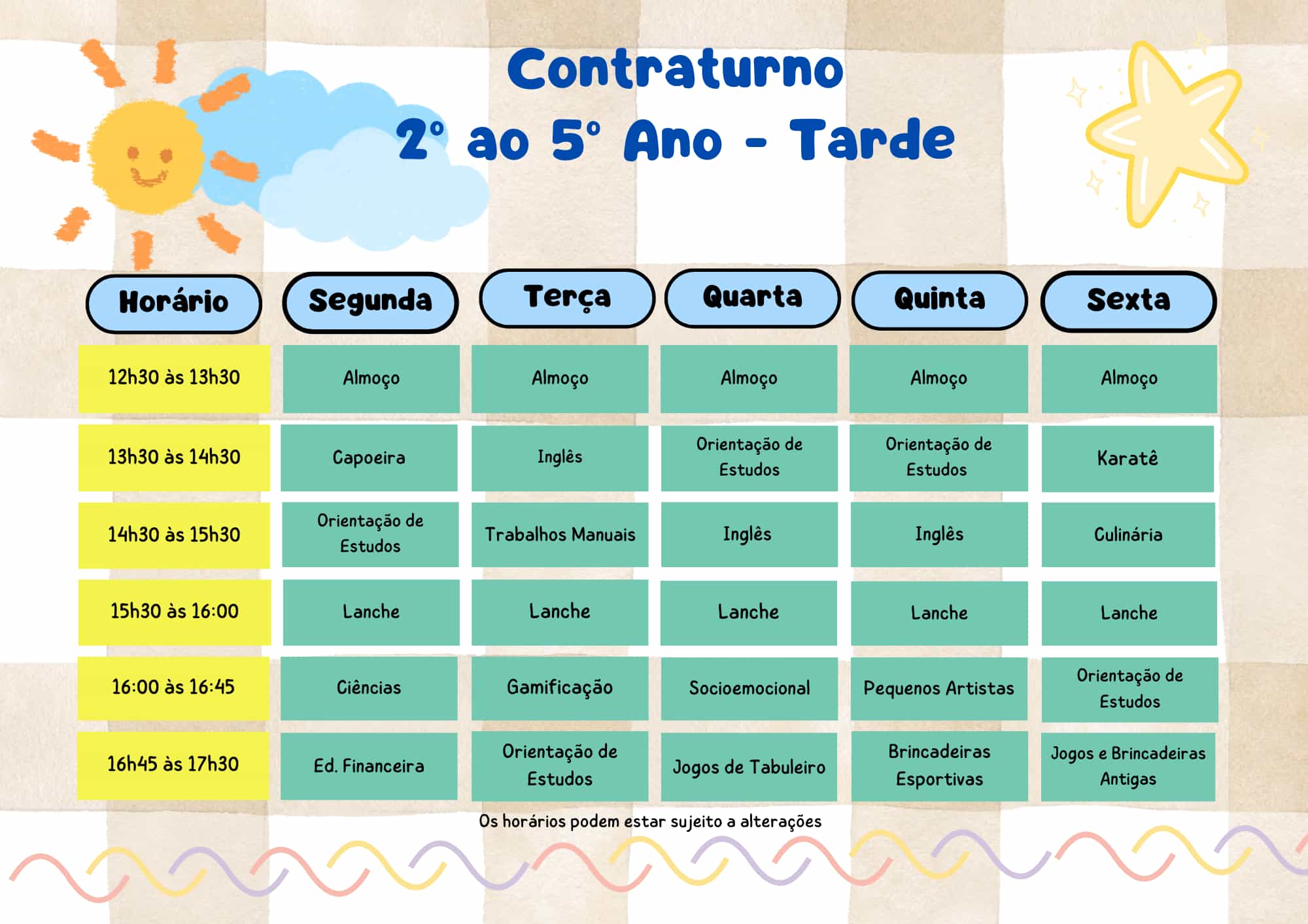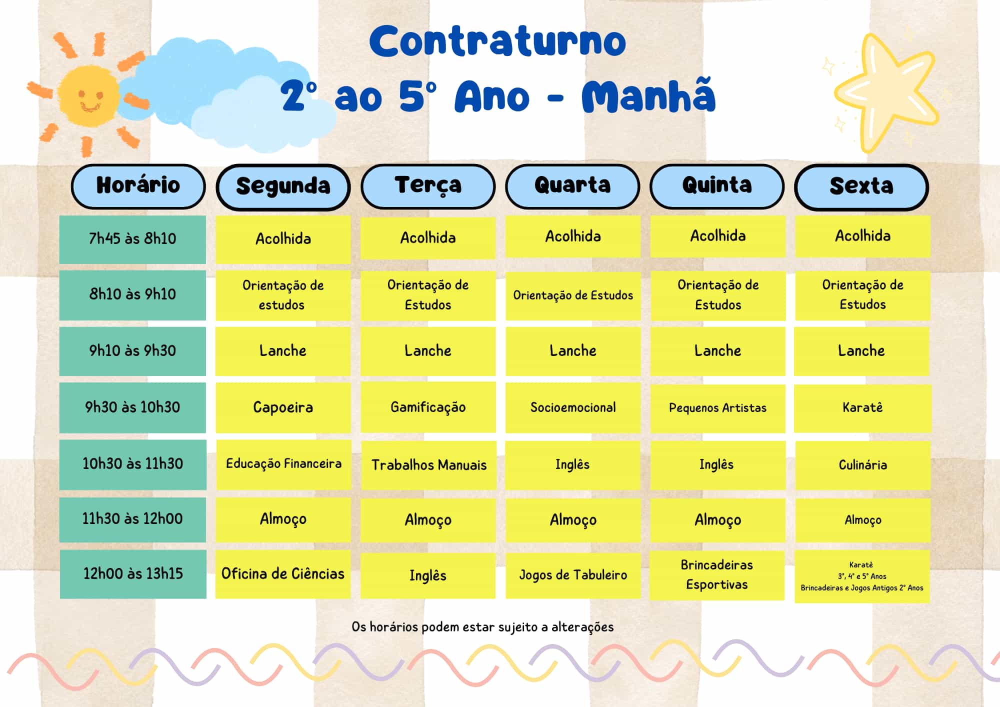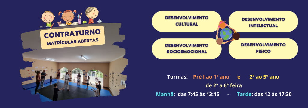 Oficinas variadas e atividades diversas são oferecidas no turno contrário às aulas, da Ed. Infantil ao 5º ano / Fund. AI.